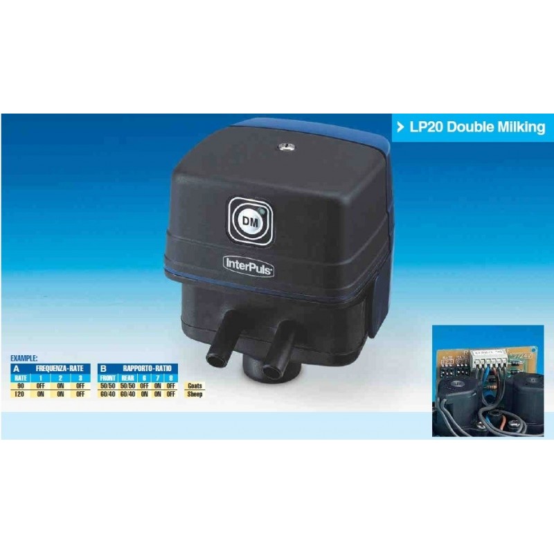 PE 9180 Pulsatore Elettronico LP20 Doppia Mungitura, progettato per la mungitura di capre e pecore nello stesso impianto, LP20 DM premendo sul tasto posto sul coperchio del pulsatore permette di passare a un set di parametri di mungitura all'altro. Modello:LP20 Programmabile Tipo: Alternato o simultaneo Tensione di alimentazione: 24VDC livellata Assorbimento:0,26 Amp. (0.13 per bobina) Collegamento al vuoto:1/2” Gas femmina Sistema di azionamento:Elettronico,“Servo” a membrane indipendenti Materiale del corpo: Resina termoplastica. Il costo è di un pezzo singolo, per installazioni o sostituzione dei vostri pulsatori esistenti, il prezzo varia dalla quantità, chiamateci senza impegno saremo lieti di inviarvi un preventivo (senza impegno da parte vostra)