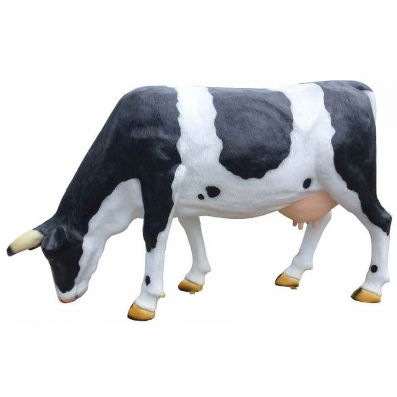 Statua mucca razza frisona testa bassa H 135x210 cm vetroresina, adatta per allestimenti fieristici, agriturismi, aziende agricole,macchinette latte e arredo giardino. Possibilità di personalizzazione con logo aziendale e colorazioni su richiesta. Figura resistente ai raggi UV ed agenti atmosferici. Ogni statua è dotata di staffe ai piedi per ancoraggio a terra.